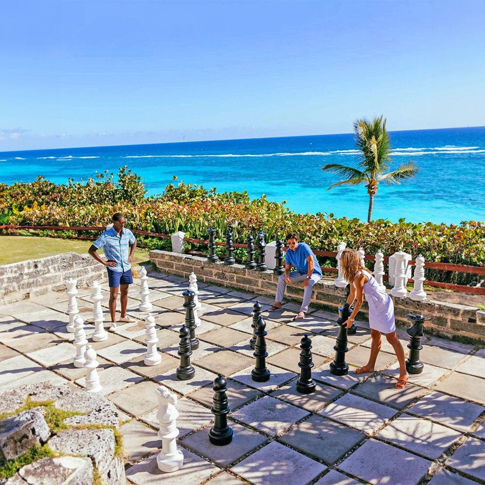 - HIGHLY DURABLE MADE TO LAST: These jumbo plastic chess sets are displayed worldwide in various climates and environments. They can stay outdoors for extended periods without maintenance, staining, or fading, making them a great addition to any lawn, backyard, or garden. Made of high-density polyethylene (HDPE) injection-molded, hollow, recycled plastic, they are waterproof, resistant to UV rays, and will retain their huge shape and color regardless of the weather.